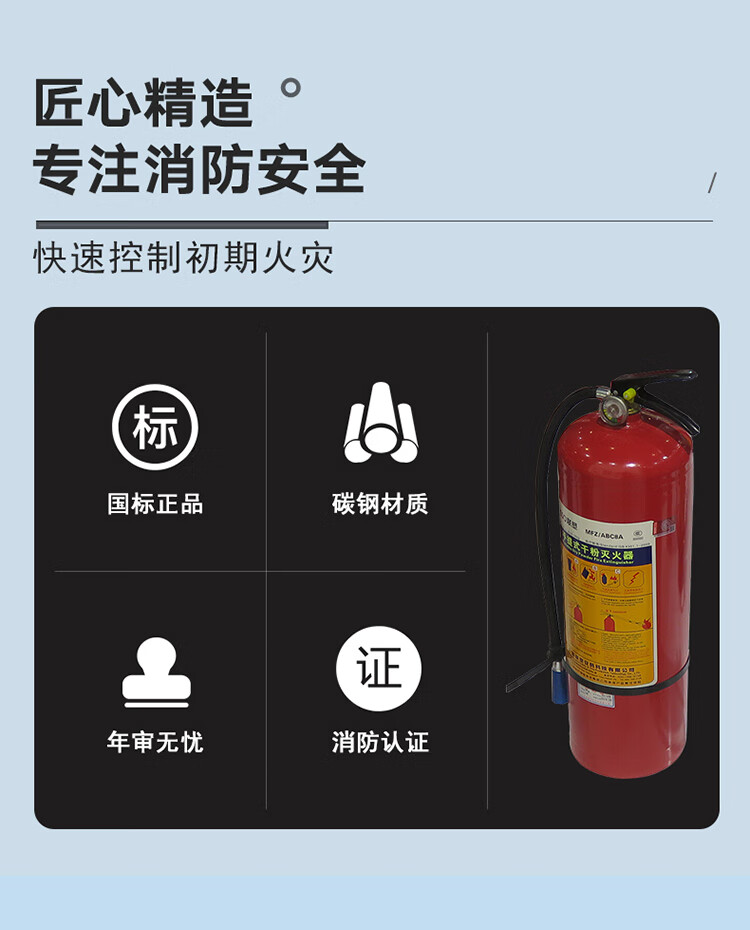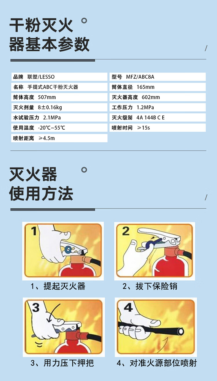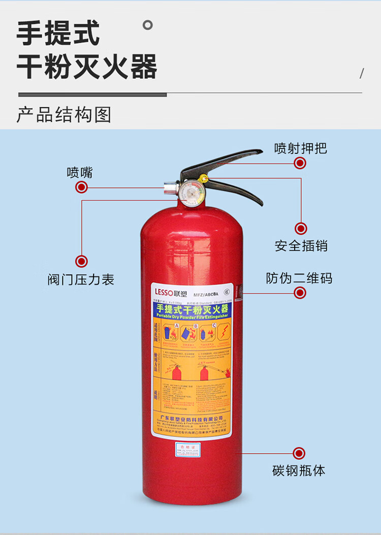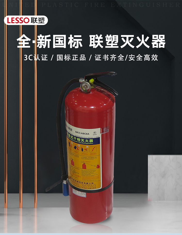 商品名称:联塑(LESSO)灭火器 MFZ/ABC8A 手提式干粉灭火器8Kg 商用公司室内灭火器8公斤 带3C认证标记 单位:个