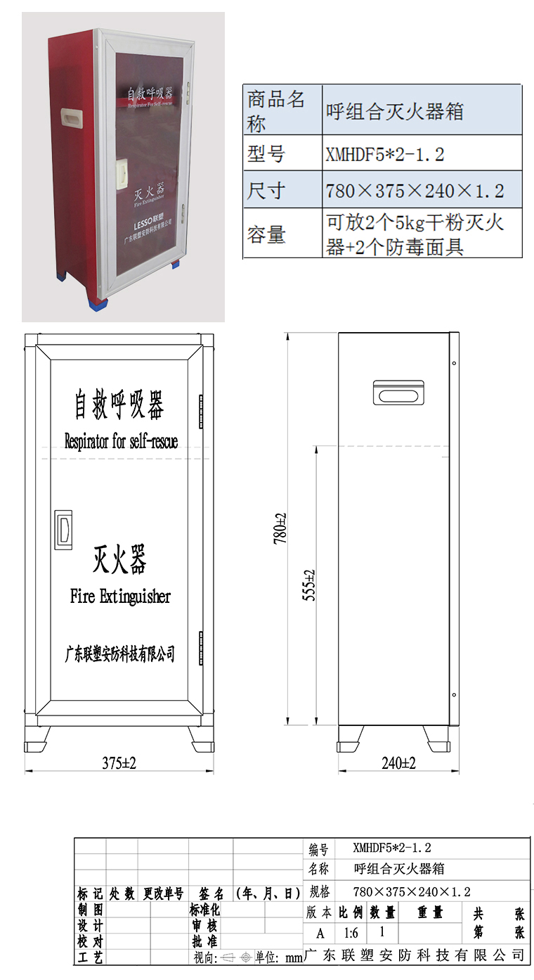 商品名称:联塑(LESSO)XMHDF5*2-1.2 呼组合灭火器箱780x375x240x1.2 可放2个5kg干粉灭火器+2个防毒面具 单位:个