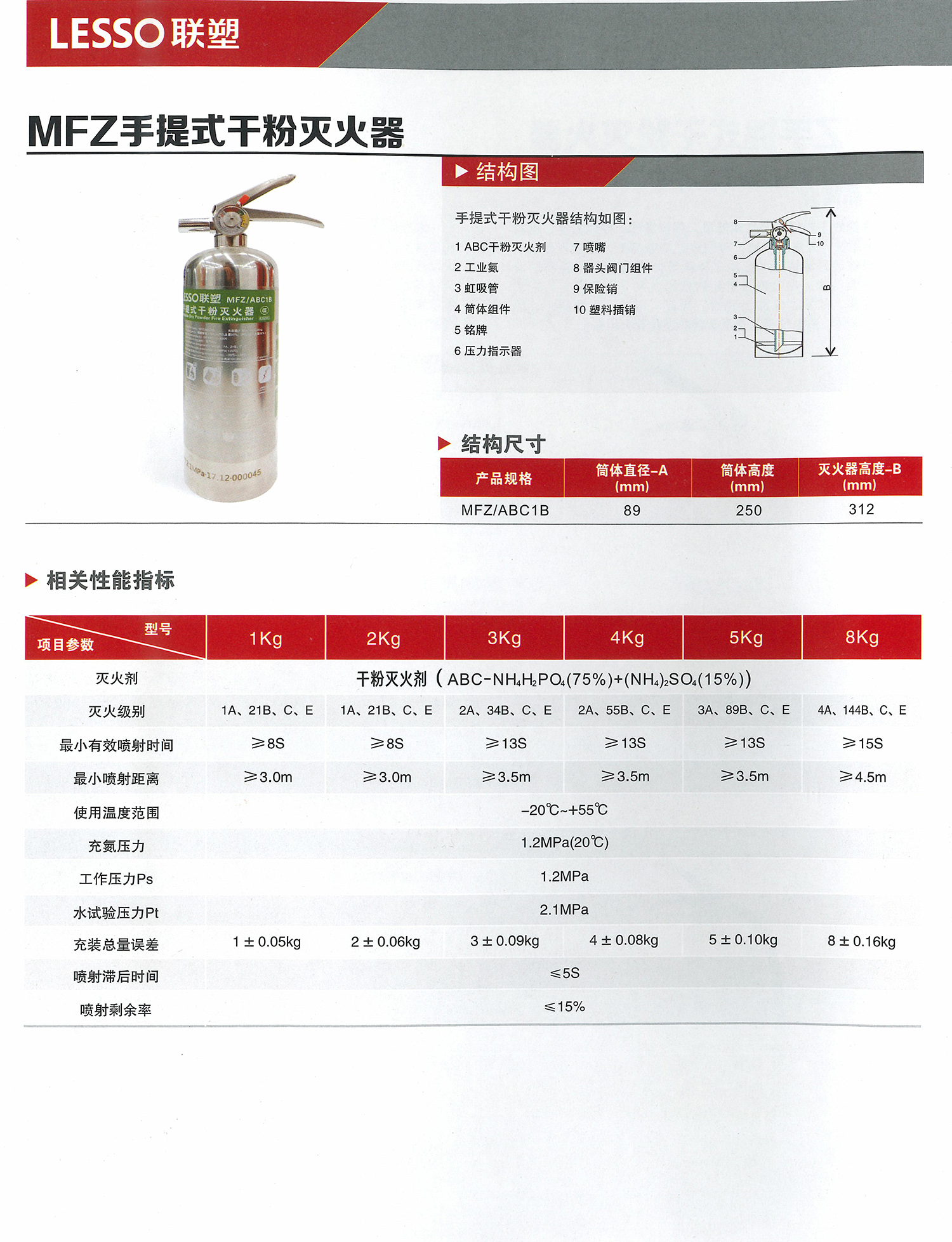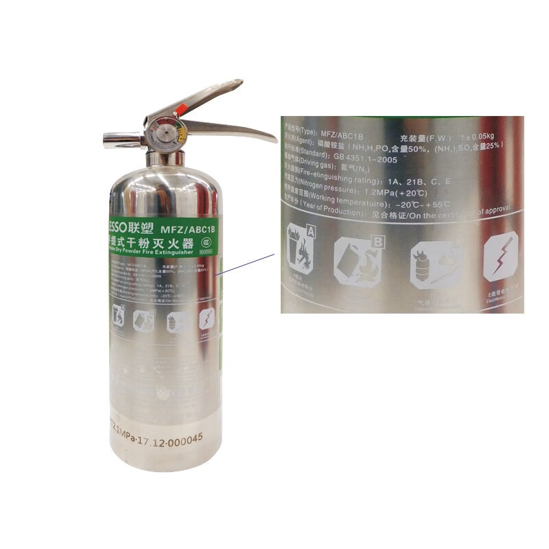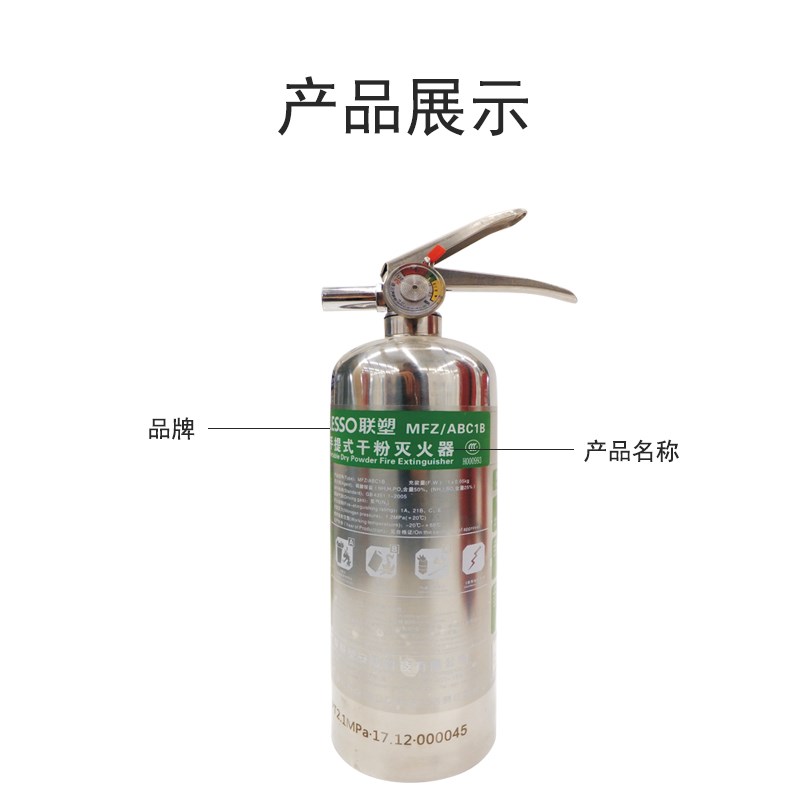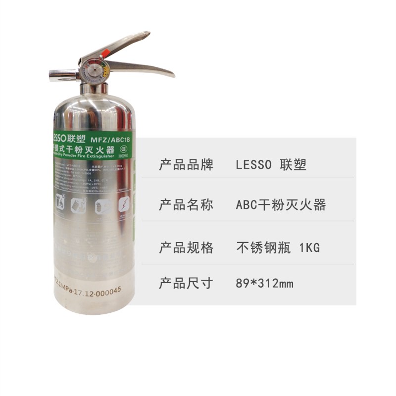 商品名称:联塑(LESSO)灭火器 MFZ/ABC1B 手提式干粉灭火器(不锈钢瓶)1Kg 带3C认证标记 单位:个