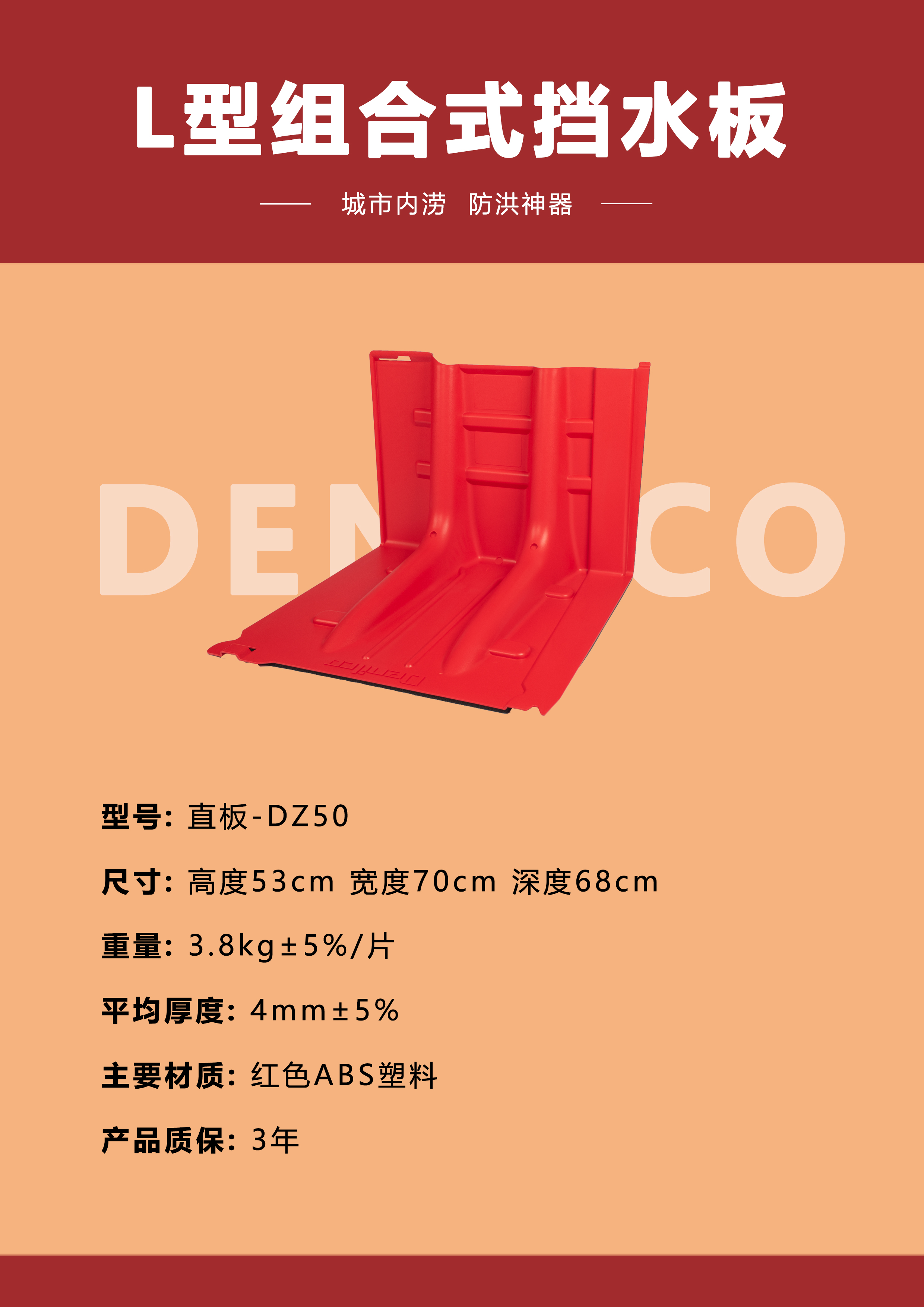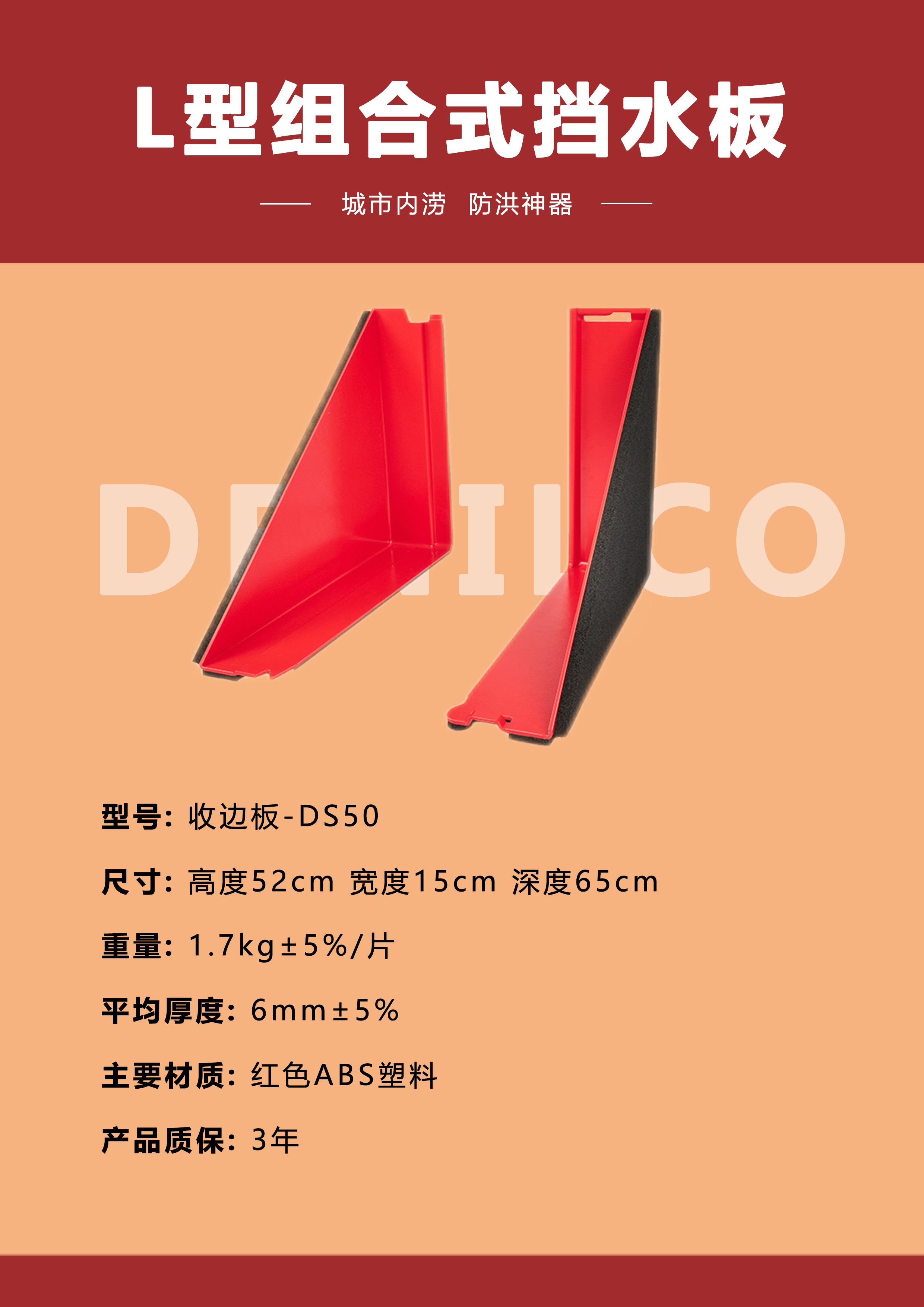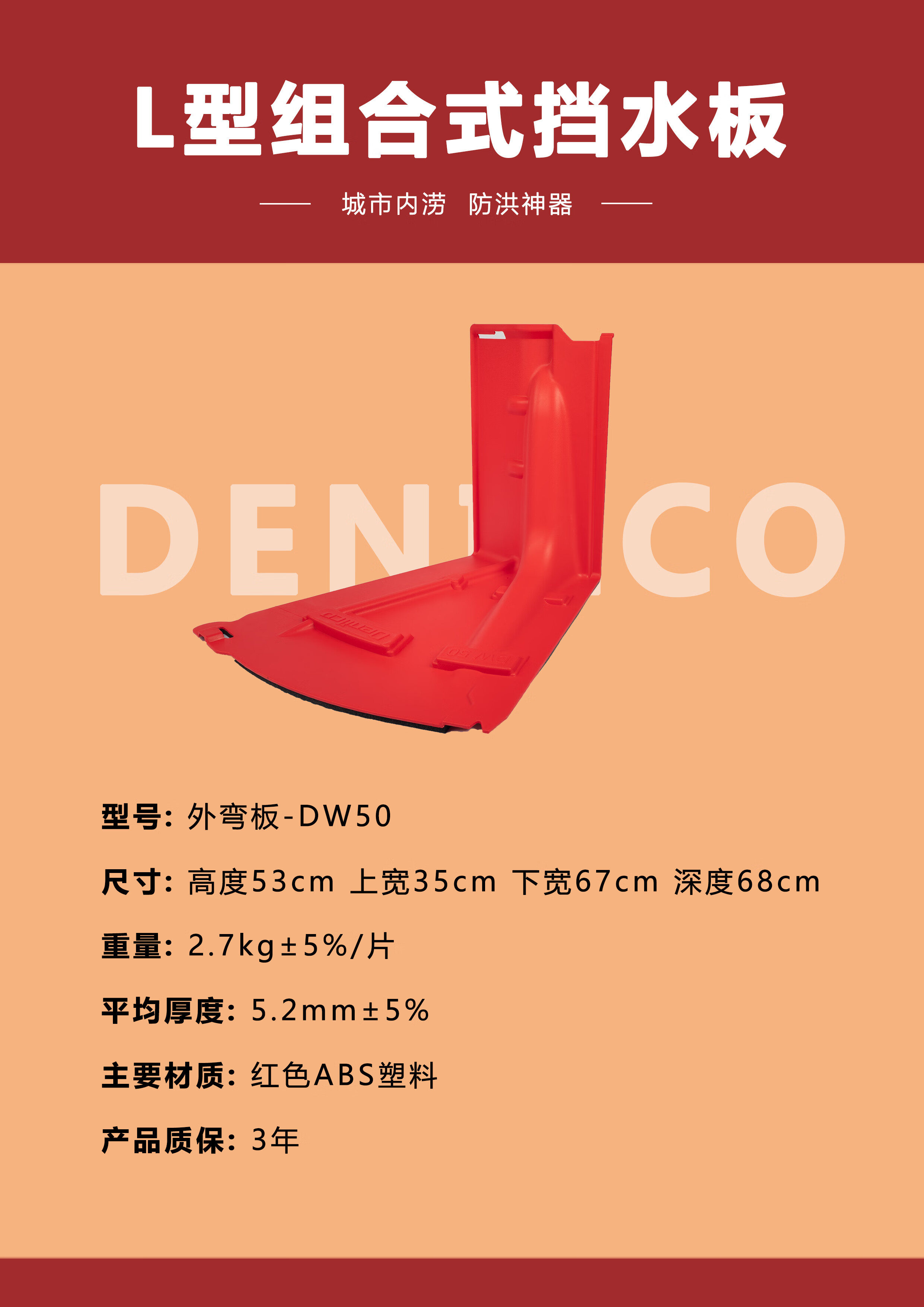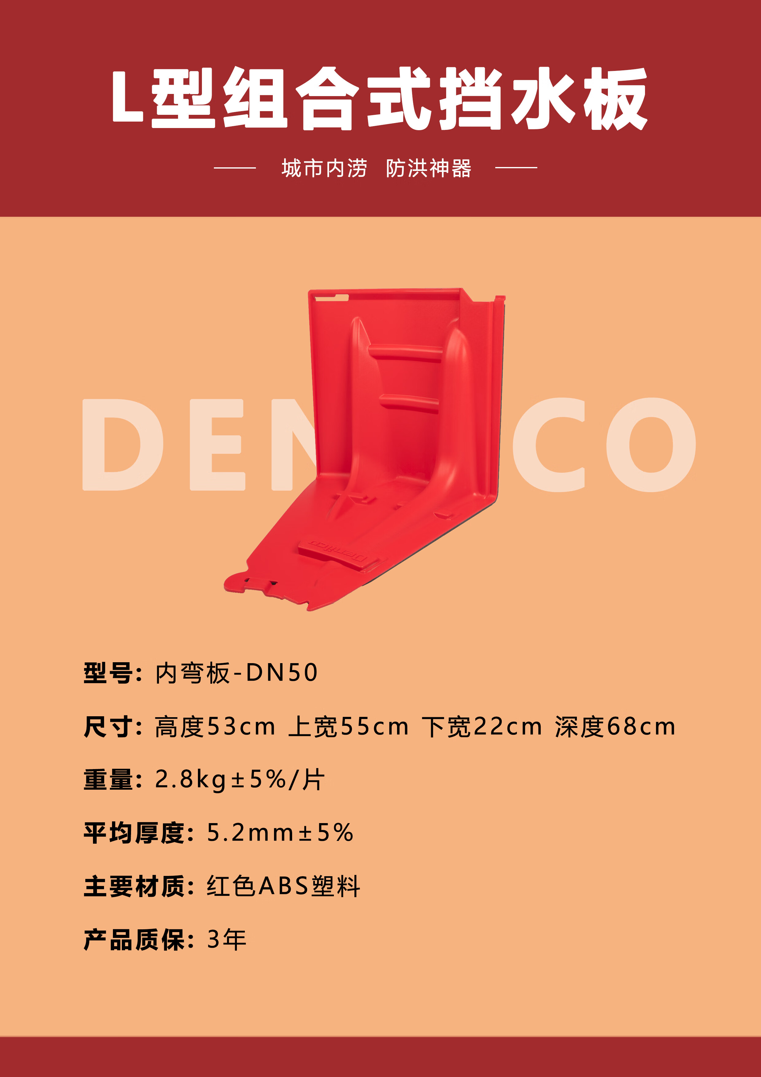 商品名称:德尼尔科 防洪板L型组合式挡水板组合围井53厘米高度新型防汛物资灵活便捷用于城市防汛 内弯板-DN50 单位:块
