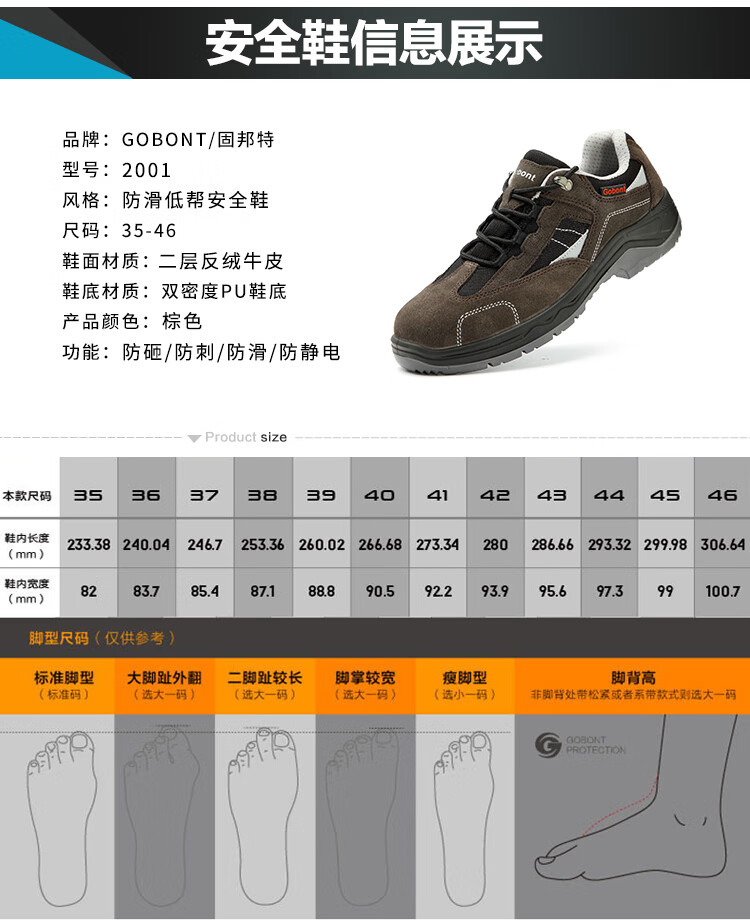 商品名称:固邦特(Gobont protection) 2001劳保鞋防砸防刺穿防静电防滑工作防护安全鞋企业定制 (36-44码可选 下单备注) 棕色 单位:双