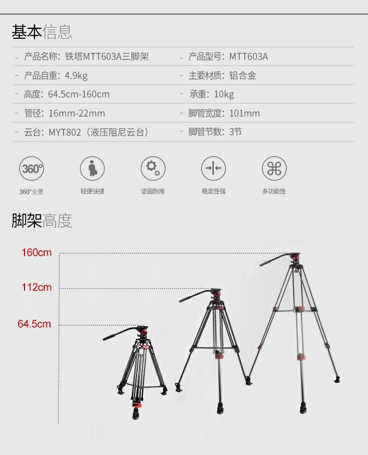 商品名称:miliboo/米泊 单反摄影摄像机三脚架带液压云台便携铝合金角架 603A