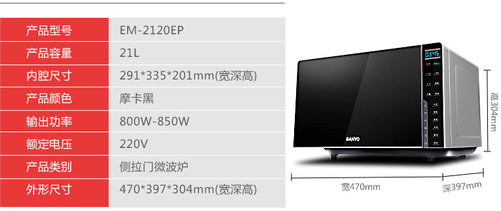 商品名称:三洋/Sanyo 21L家用光波烧烤微波炉纳米涂层微波炉 EM-GF2120EP