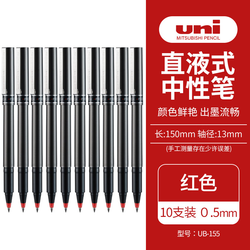 商品名称:三菱(Uni)UB-155中性笔走珠笔0.5mm学生考试用笔耐水耐晒办公签字笔红色 10支装 单位:盒