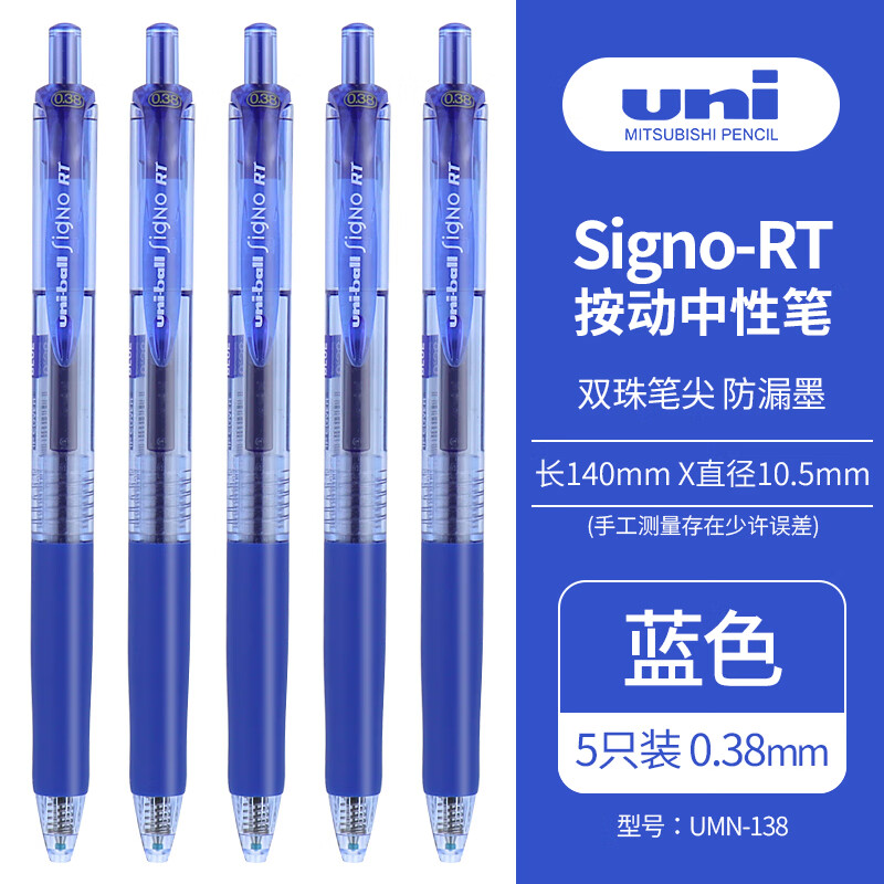 商品名称:三菱(Uni)UMN-138按动中性笔0.38mm财务办公考试笔(替芯UMR-83)蓝色5支装 单位:盒