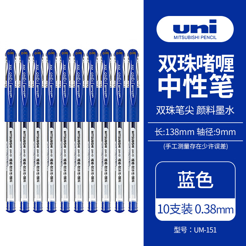 商品名称:三菱(Uni)UM-151财务用笔0.38mm学生用中性笔(替芯UMR-1)蓝色 10支装 单位:盒
