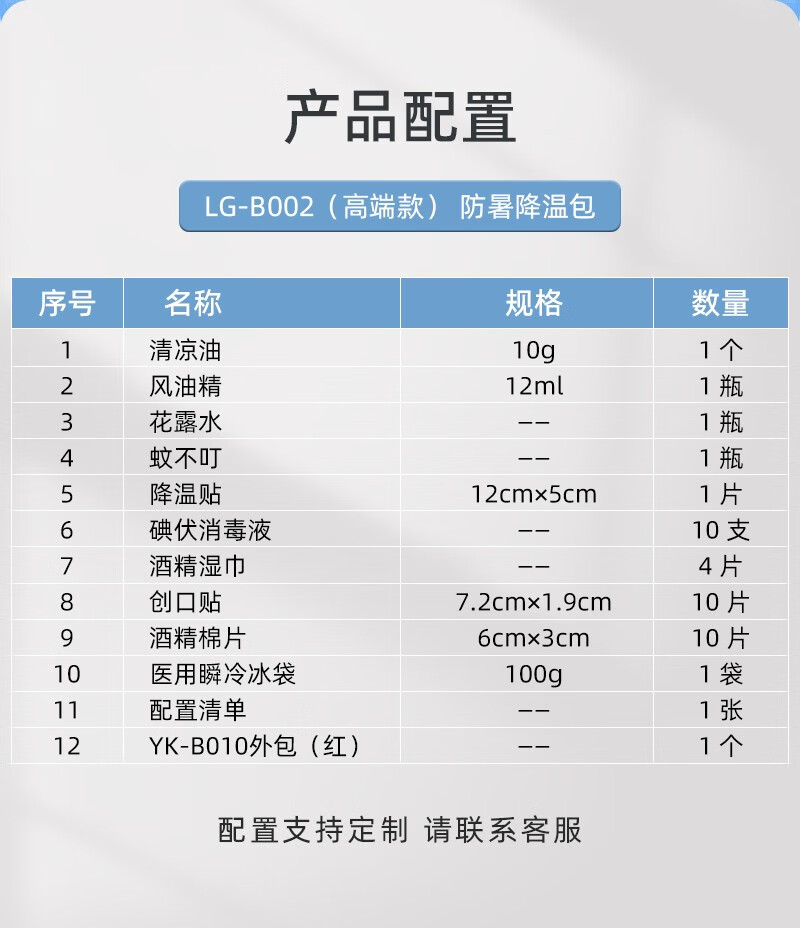 商品名称:优科先行高温慰问用品套装 防暑降温包 LG-B002(高端款) 单位:套